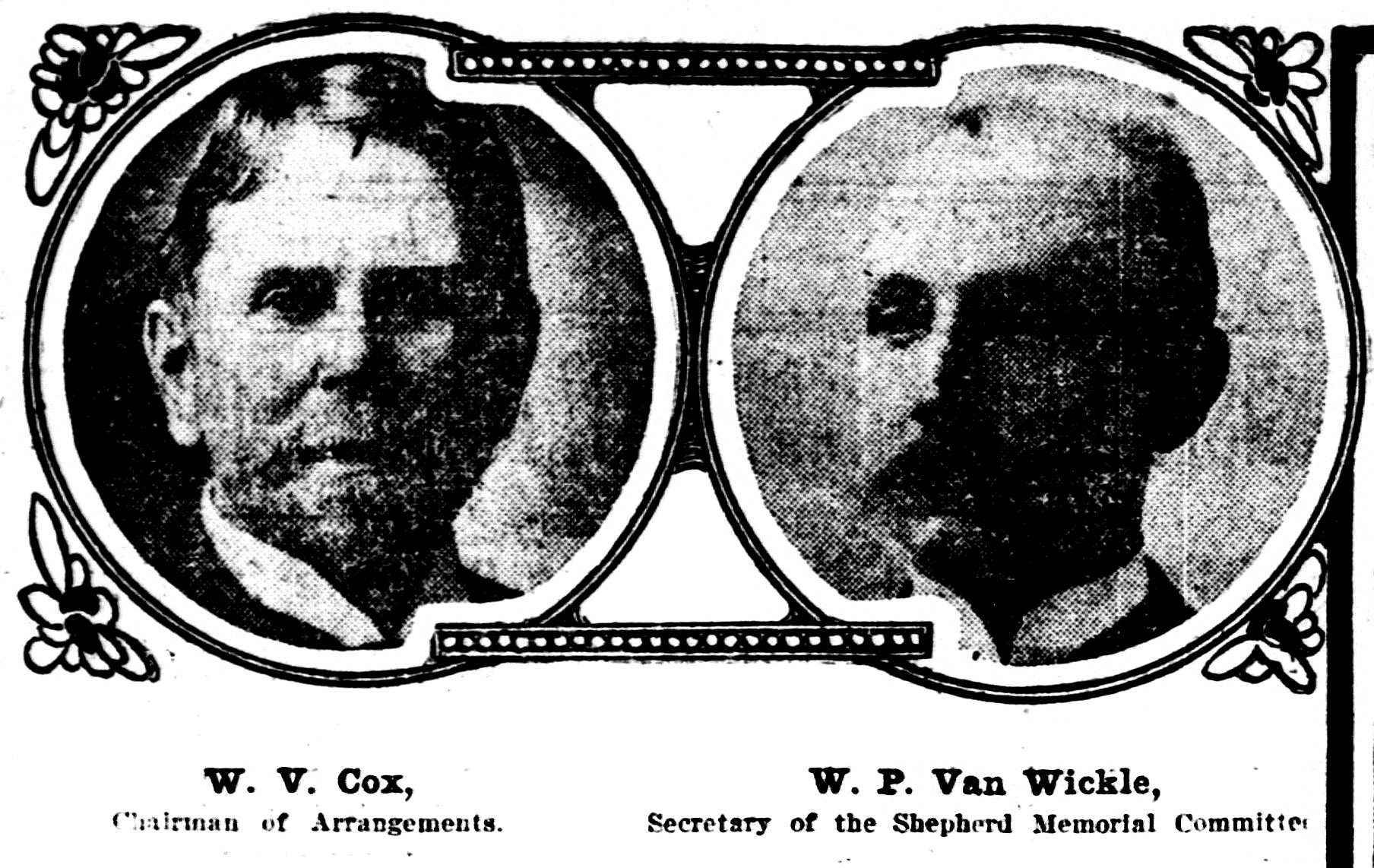 The Shepherd memorial committee, which has had charge of the erection of a memorial to the former governor, is composed of Theodore W. Noyes, chair man; John F. Wilkins, vice chairman; Charles J. Bell, treasurer; William P. Van Wickle. secretary; Brainard H. Warner, chairman of finance committee; William V. Cox. chairman of arrangements committee; Scott C. Bone, Barry Bulkley, Samuel W. Curriden, Henry E. Davis, James E. Fitch. William F. Gude, George H. Harries. Rudolph Kauffmann, John R. McLean. William F. Mattingly, Frank A. Munsey. James F. Oyster, E. Southard Parker, R. Ross Perry, Frank K. Raymond, Edgar D. Shaw, Louis P. Shoemaker. J. H. Small, Thomas W. Smith. O. G. Staples, Alexander T. Stuart. C. H. Syme and George Truesdell