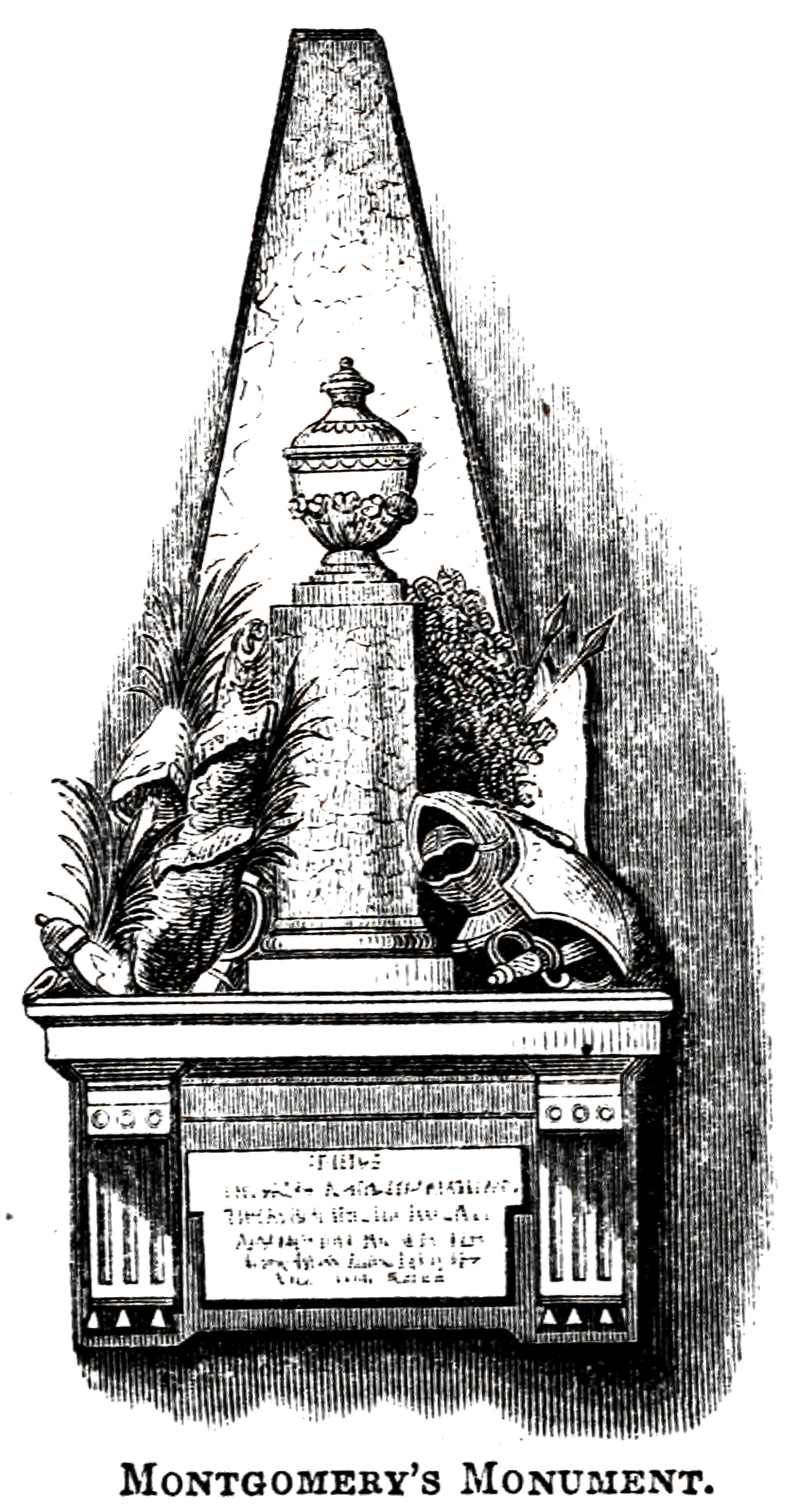 This monument is erected by order of Congress, 25th of January, 1776, to transmit to posterity a grateful remem- brance of the patriotic conduct, enterprise, and perseverance of Major-general Richard Montgomery, who, after a series of success amid the most discour- aging difficulties, Fell in the attack on Quebec, 31st December, 1775, aged 37 years.