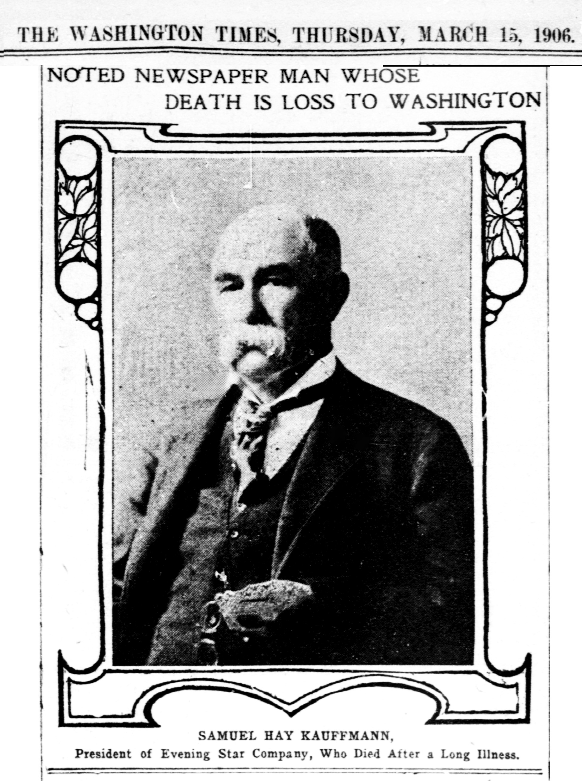 After a long illness Samuel Hay president of the Evening Star Newspaper Company and one of Washington's most prominent citizens died shortly before 2 o'clock this morning at his residence, 1421 Massachusetts avenue northwest. All the members of his family were at the bedside when the end came.